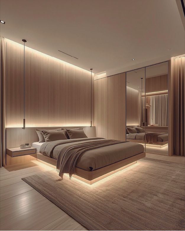• Las recámaras Japandi suelen incluir madera clara, textiles naturales y muebles de proporciones bajas, creando